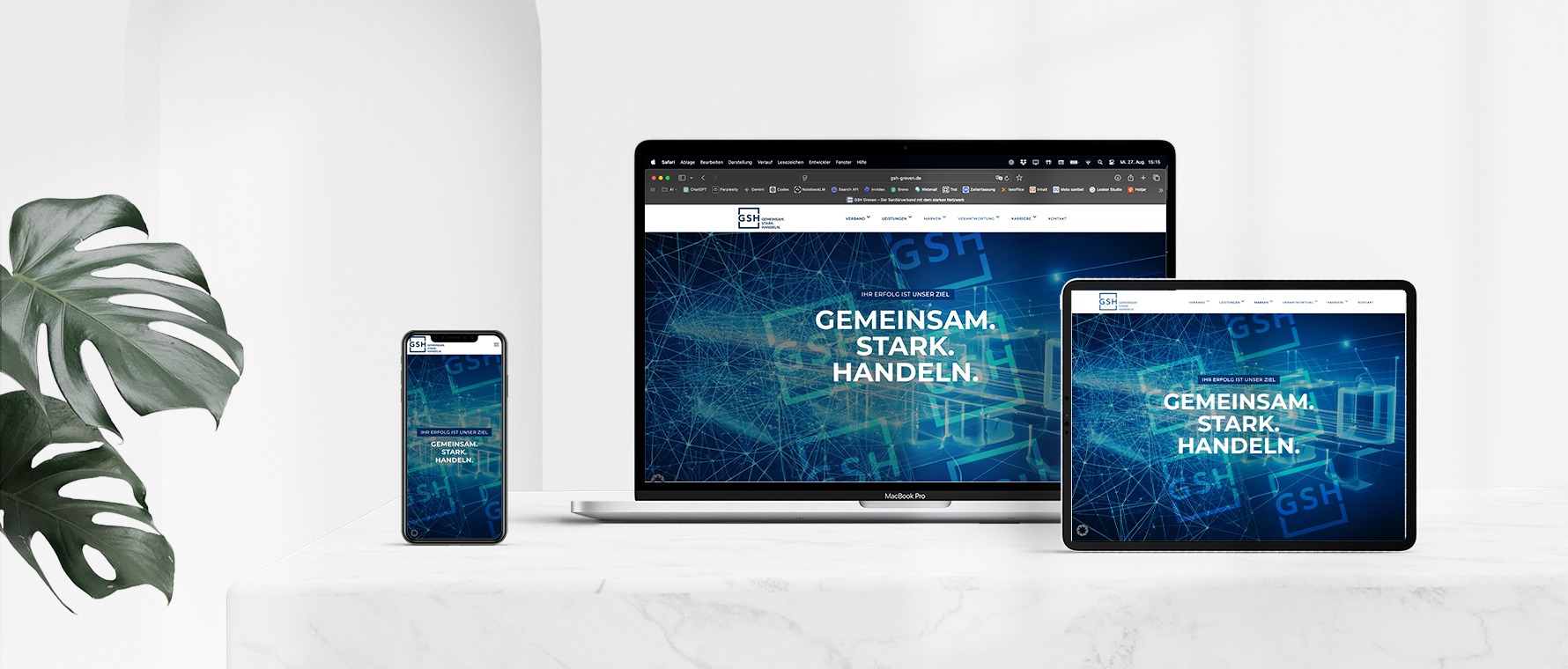 Übertragung der neuen GSH-Formensprache (Rahmen/Klammer) ins Interface. Komponentenbibliothek, States und Responsives Raster für eine konsistente Marke.