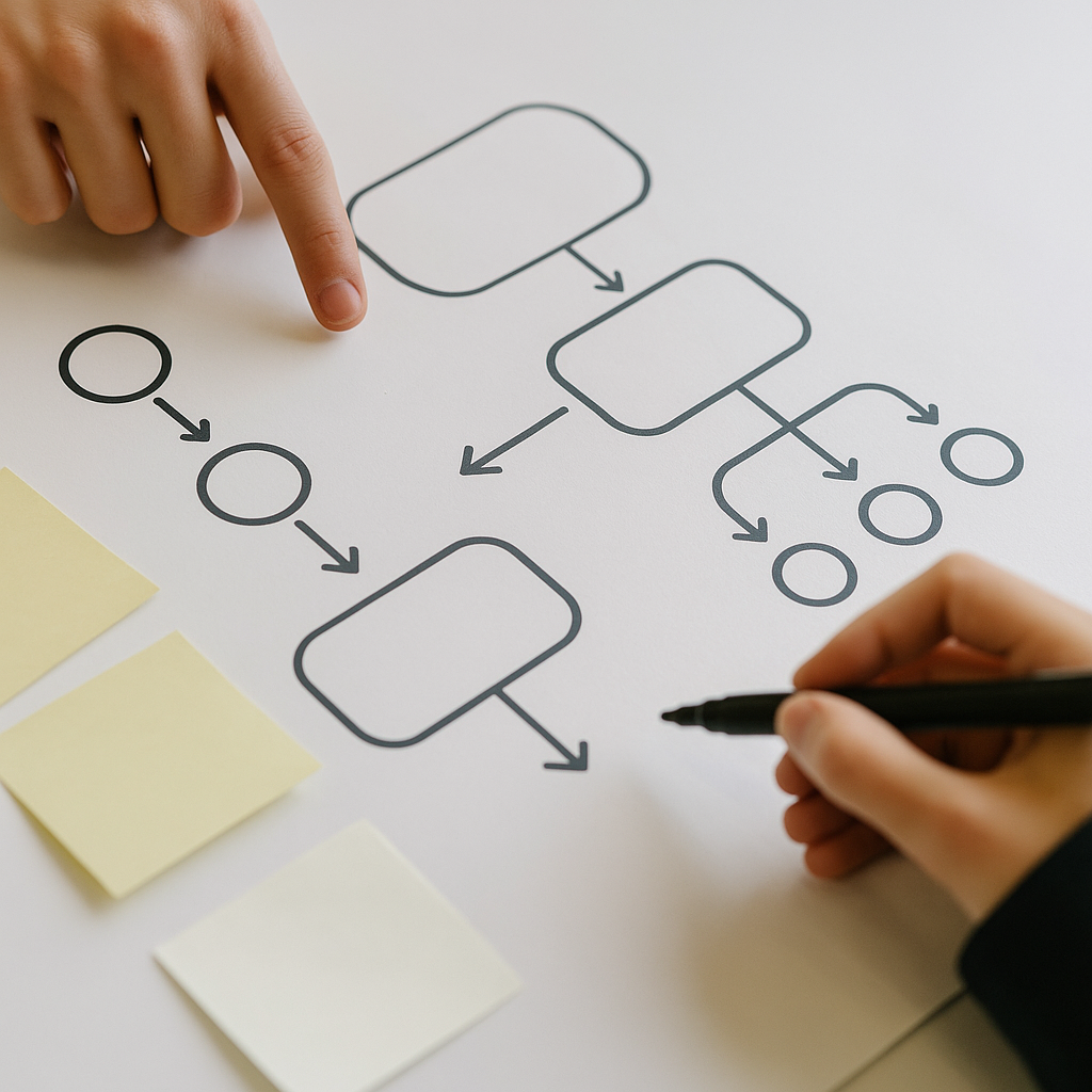 Sitemap und Nutzerflows. Navigation und Startseiten-Storyline werden so reduziert, dass jeder in wenigen Klicks ans Ziel kommt.
